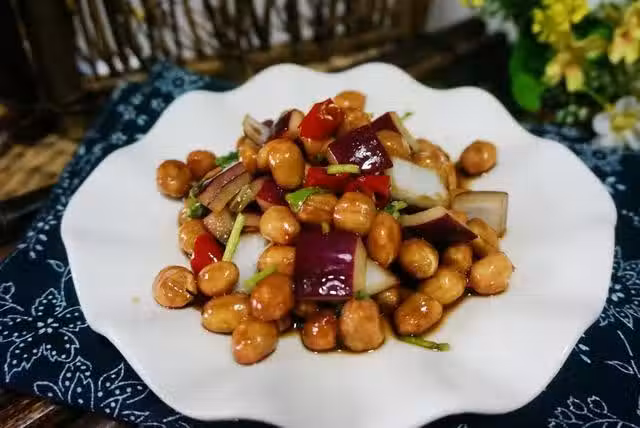 1.鍋中放入少於食用油,涼油放入花生米,炸至變色,控油備用。