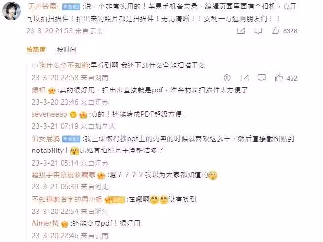 貼文引發討論後,立即有人回應,iPhone的手機備忘錄裡有個相機的標示,點選以後可以在備忘錄裡直接掃描文件,不但能夠直接掃描整個畫面,還會自動轉成PDF檔,拍出來的圖片也比直接拍照乾淨,相當實用。