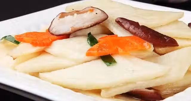 4 熱鍋注油,倒入茭白、香菇和胡蘿蔔片,翻炒1分鐘。