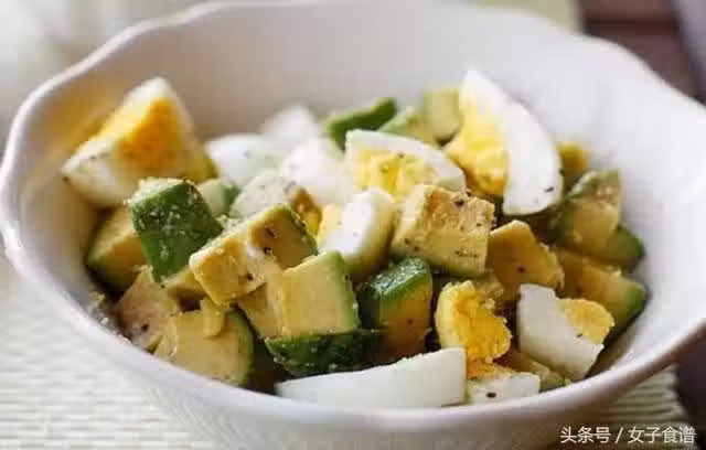 4、把牛油果塊和雞蛋塊混合,灑點鹽和黑胡椒碎輕輕拌勻即可。