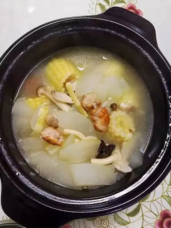 冬瓜500克;草菇八個;各類菌菇少量;玉米棒2個;小肉丸(或鹹肉)10個;咸筍(扁尖)適量;黑木耳適量
