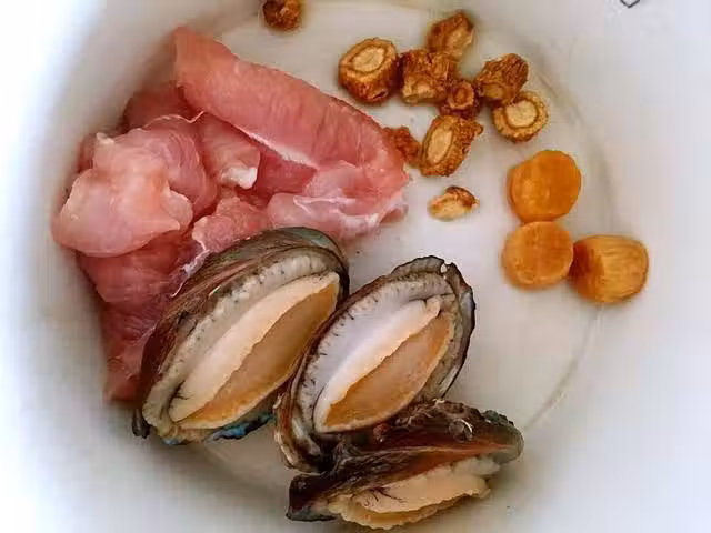 鮑魚3隻(3人份);西洋參數片或根;瘦肉適量;乾貝適量;鹽少量調味