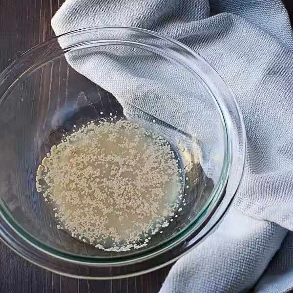 2.酵母水混合麵粉和白糖。用酵母水攪勻,開始進一步揉麵,一定要有耐心,溫水一點一點的加入,開始用筷子攪成雪花狀的面絮,再慢慢揉成偏硬的麵團。