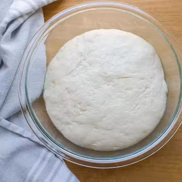 這時候繼續把發酵的麵團拿出來,在案板上繼續撒點麵粉揉至麵團變得光滑。
