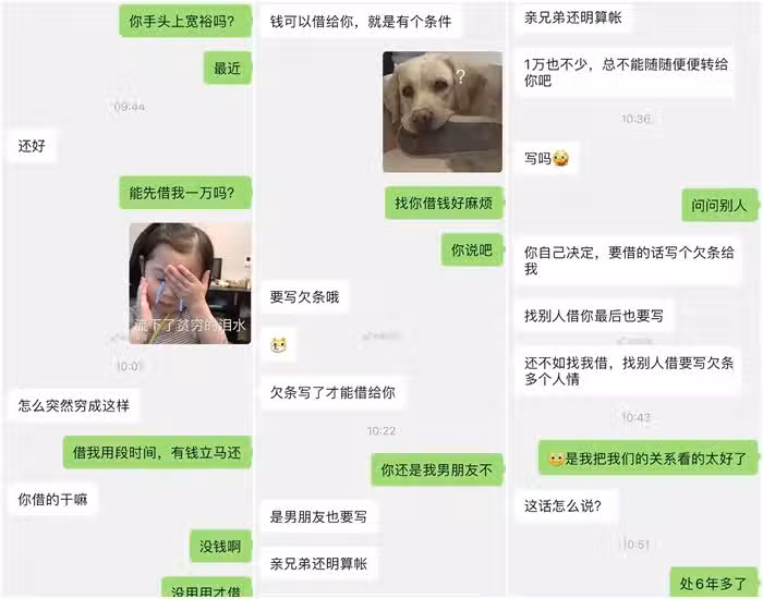 原PO表示:「是我把我們的關係看得太好了,都處6年多了,借1萬塊(約新台幣4.5萬元)還要寫欠條,是我沒想到的」,但男友則表示,自己不是不借,只是要求寫個欠條,他認為這是借錢的規矩,跟是否談了6年戀愛沒有關係,但女方卻覺得都已經交往6年,已經跟親情沒兩樣,借的這筆錢也沒有很多,寫欠條很傷感情。