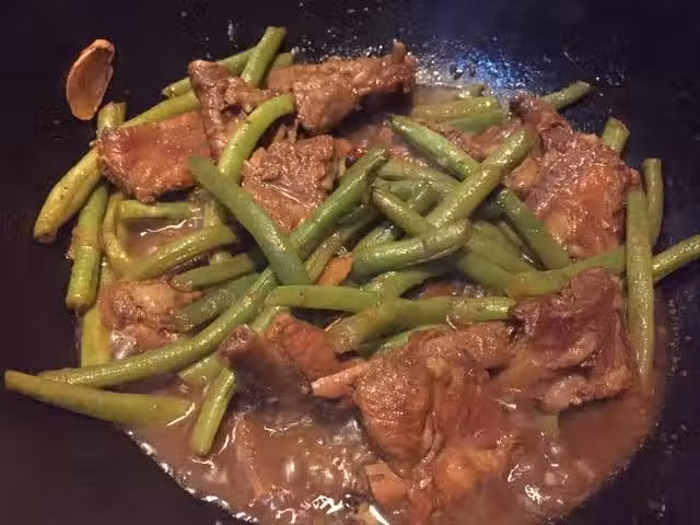 7.打開鍋蓋,繼續用大火收汁至濃稠,湯汁有層層拉絲的感覺。將收好汁的排骨燉四季豆倒入盤中即可
