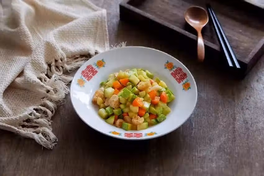 2、胡蘿蔔和西葫蘆切小丁,生薑切末