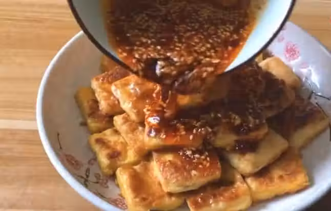 調好的料汁澆在豆腐上,也可以直接蘸著吃。
