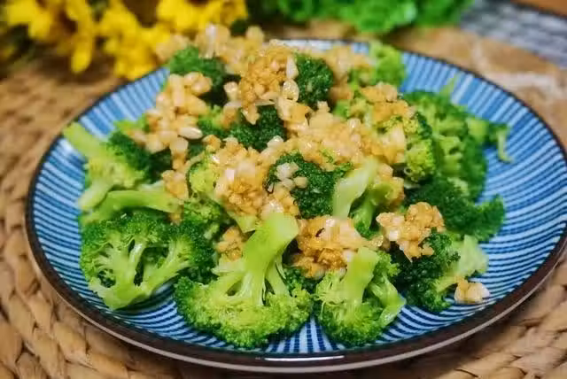 西藍花1顆,蒜末1頭,油少許,鹽1克,生抽2勺