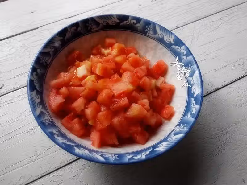 下入西紅柿丁翻炒,翻炒至西紅柿丁軟糯出水