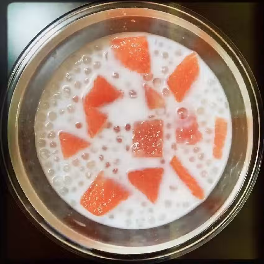3、將椰汁倒入杯中,放入煮好的西米露,放涼;
