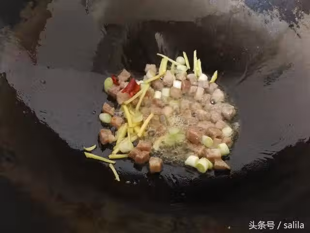 3、放入胡蘿蔔丁中火翻炒,胡蘿蔔過一下油可以讓胡蘿蔔中的油溶性的胡蘿蔔素充分釋放出來。順序不要弄錯了,胡蘿蔔比土豆要難熟,所以胡蘿蔔應該先下鍋。