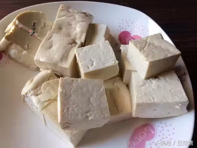 4、把豆腐切成小四方塊這樣方便煎制及食用