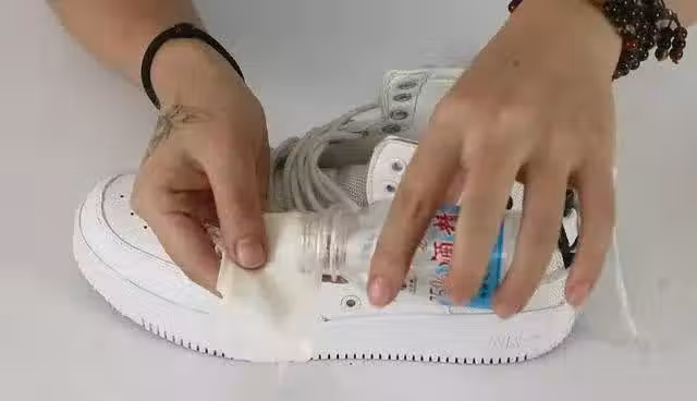 然後把它放在鞋子腳後跟擠腳的地方,因為這個鞋子呢腳後跟肯不會擠腳的,只是把它拿來演示一下,如果腳趾的這個地方,同樣也是在紙巾上倒上一點酒精,把這個放在我們鞋子裡腳尖的這個地方,