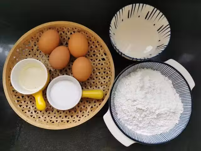 先稱好糯米粉、白糖、玉米油、牛奶。準備兩個無水無油的打蛋盆。