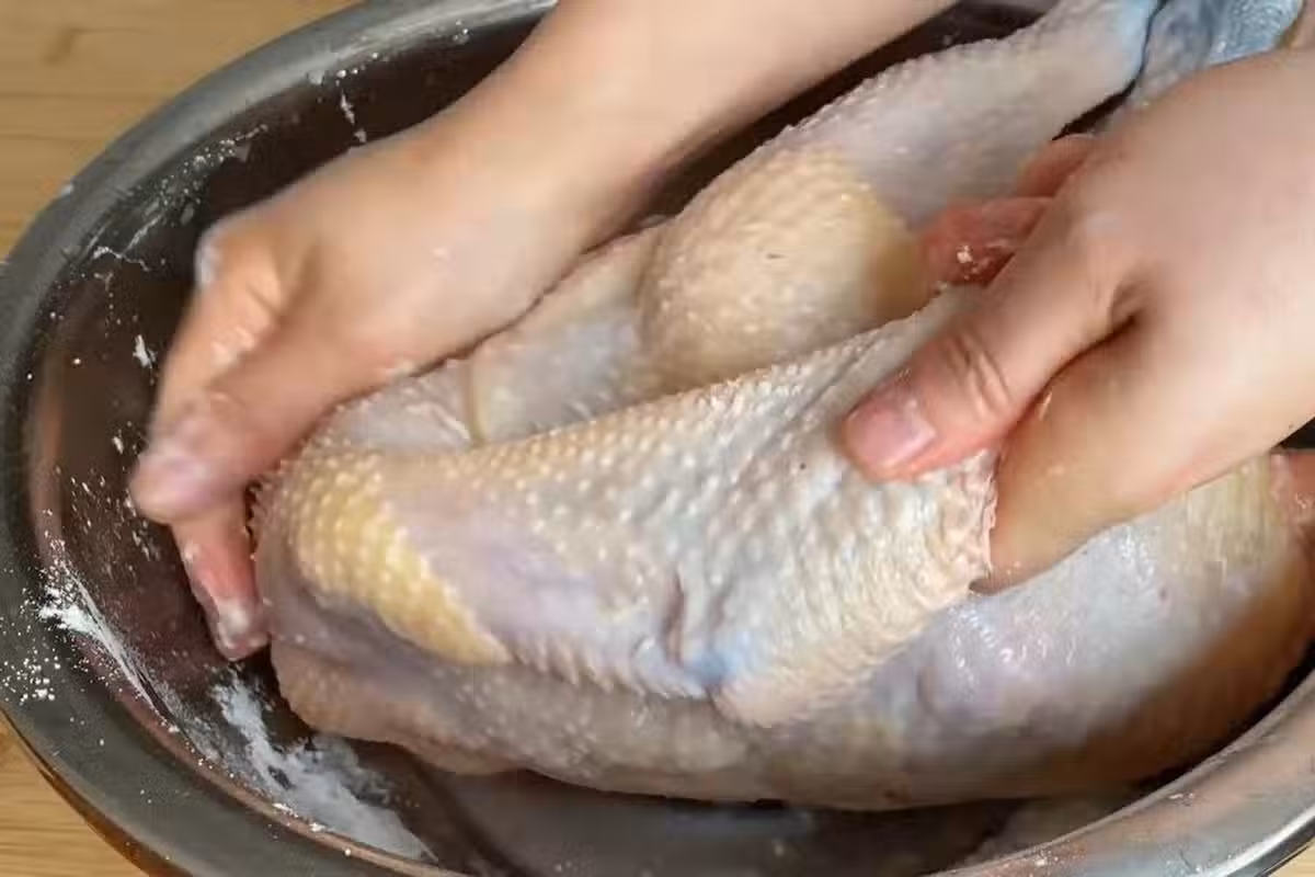 2、在雞的表面裹上適量的麵粉,用手搓勻,麵粉有吸附異味和雜質的作用,比起直接用清水沖洗,加上麵粉搓洗會洗得更加乾淨。