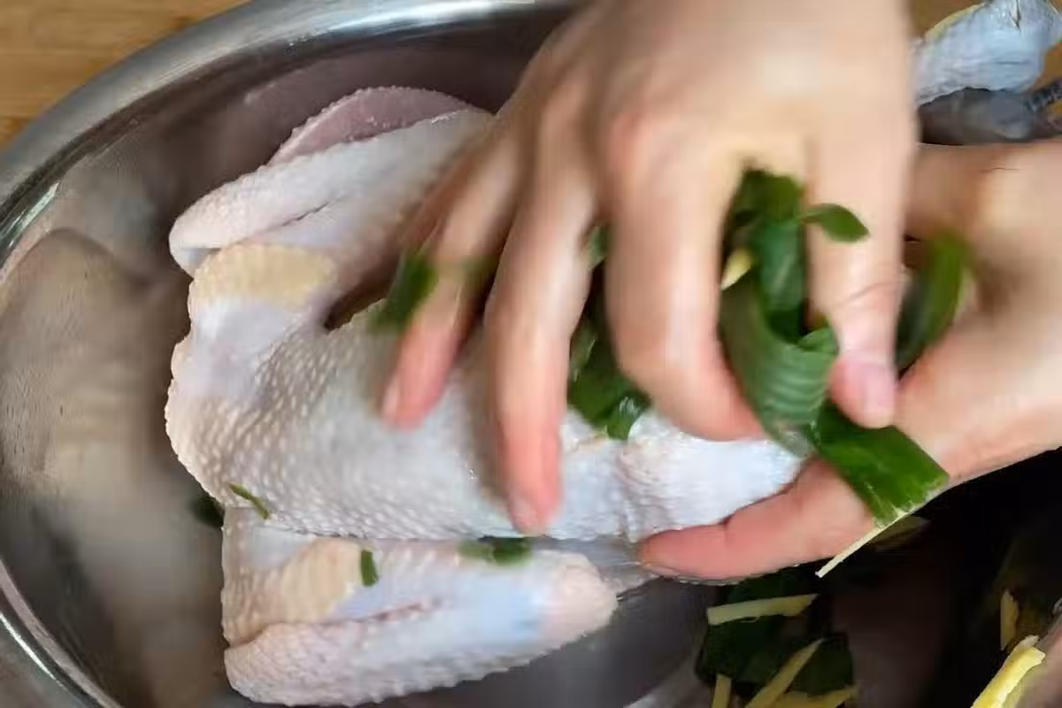 6、用薑絲和蔥段不停揉搓雞肉表面,讓薑汁和蔥汁附帶到雞肉上面,去掉雞肉的腥味。