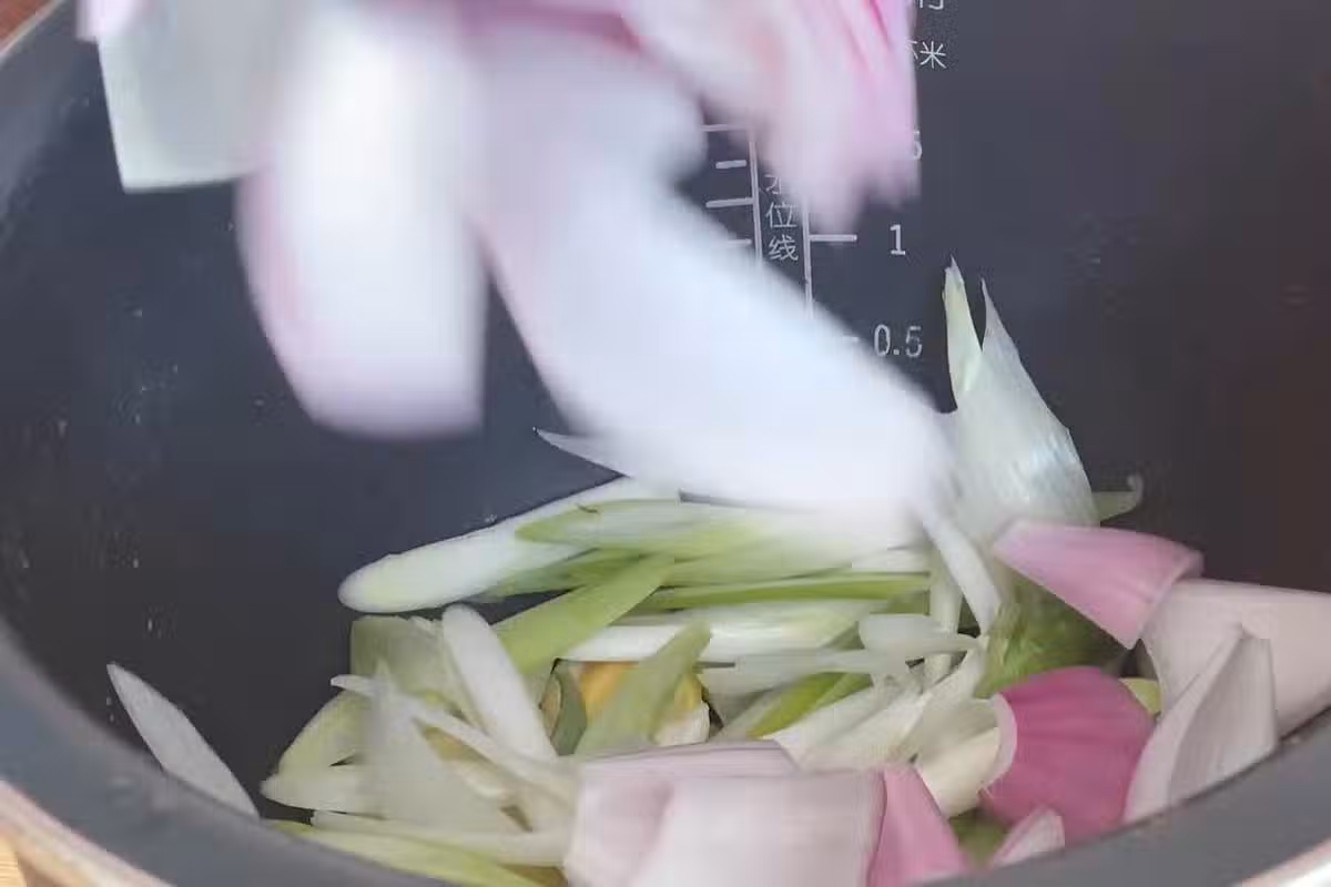 9、將生薑切片、蔥白切段、大蒜切片,洋蔥切塊放到電飯煲底部。這些佐料一方面是增加雞肉的香味,另一方面是能夠隔離雞肉和電飯煲的底部,防止雞肉粘住電飯煲底部。