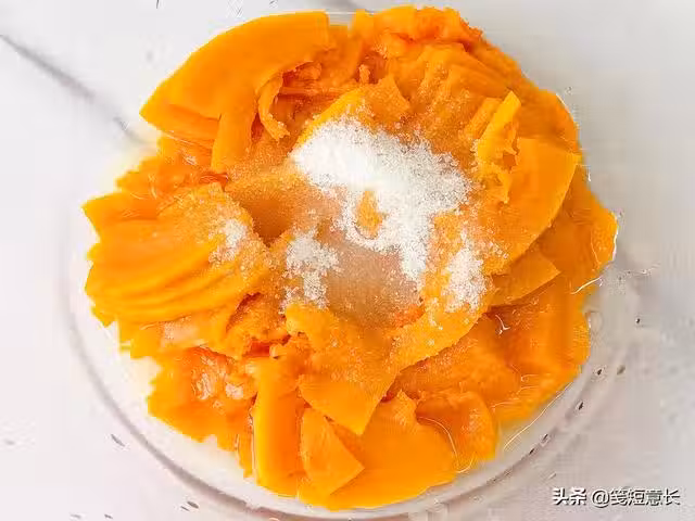 3、蒸熟的南瓜片不需要再用料理機打碎,用勺子輕輕按壓就能碾成細膩的南瓜泥。將南瓜泥放置到微溫的程度,篩入300g麵粉,磕入2枚雞蛋,最後放入酵母粉,借著南瓜泥的溫熱幫助酵母粉發酵。