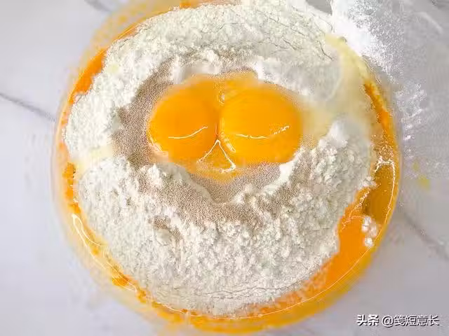 4、用筷子將麵粉和雞蛋充分攪拌均勻,所有食材融入南瓜泥中。根據南瓜泥的出水量多少來添加牛奶,邊倒邊用筷子攪拌,攪拌至碗中沒有乾麵粉的程度,用手掌的力量將面絮揉成不粘手的南瓜麵糰。