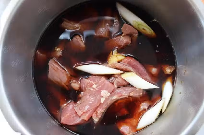 裡脊肉洗凈剔除筋膜,切成塊。豎紋路盡量長一點。方便下一步製作。焯燙一下血水。撈出洗凈,加生抽,老抽,蔥姜,適量水。高壓鍋壓15-20分鐘左右。