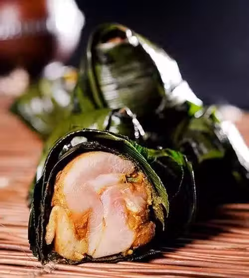 3、用泰國香蘭葉將腌好的雞腿肉逐個包成三角形狀扎嚴。