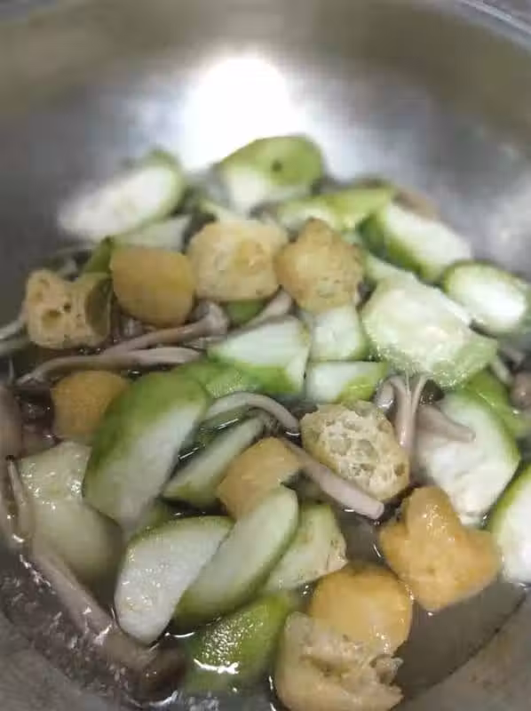 13、煮至油豆泡變軟,吸足了絲瓜和真姬菇煸炒出來的清甜湯汁。14、加入些許鹽和蘑菇粉(可省略)調味,即可起鍋。2 絲瓜燴白玉菇