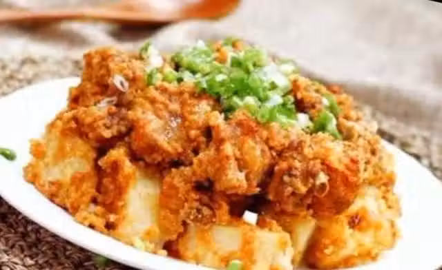 鍋中放入少量油,小火將油燒溫溫熱時放入郫縣豆瓣醬,小火炒制豆瓣醬。豆瓣醬炒出香味,並出紅油即可關火備用。將小排沖洗乾淨,控干水分。準備好蔥段和薑片。排骨中放入蔥段、薑片、鹽、生抽、老抽、糖、十三香、白鬍椒粉、酒釀,再將炒好的豆瓣醬放入,將其充分拌勻,腌制1~2小時。排骨腌制好後放入辣椒麵和花椒油拌勻,再放入蒸肉米粉調拌均勻,讓每一塊排骨都裹上米粉。土豆去皮洗凈切塊放入碗底,再把排骨放在上面,高壓鍋中放入足量開水。把排骨碗放入鍋中,(為了預防蒸氣水進入碗里,可用不鏽鋼盤蓋住碗口),之後蓋上鍋蓋開中大火,上氣後蒸製50分鐘即可,蒸好後不要立即開蓋,要等消氣後才可取閥揭蓋,出鍋後裝盤,撒上少許香蔥末,即可。非常酥爛香糯!