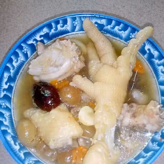 把雞的肉和骨頭分開,再把藥材全部洗干淨,拿一個大容量的燉盅,把藥材放入碗底再把雞骨頭放在上面和放幾片姜,然後用高壓鍋隔水燉一個小時