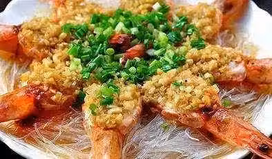 主要配料:綠豆粉絲80克、海蝦10隻、蒜蓉50克、香蔥碎15克、生抽2大匙、細鹽1/4小匙、砂糖2小匙、白鬍椒粉1/4小匙、高湯(清水)2大匙