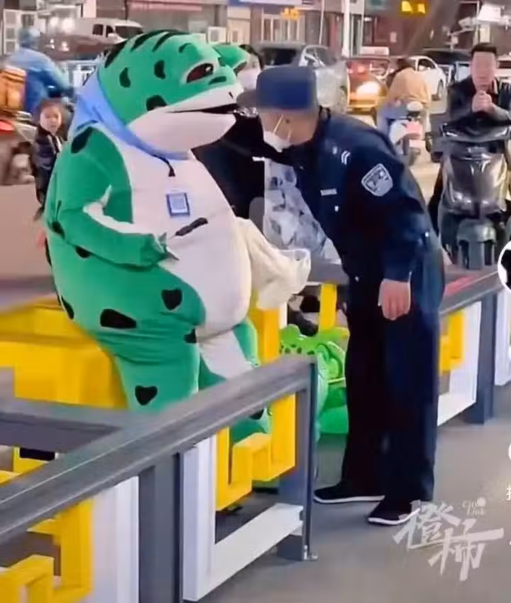 而在今年年初,網紅的「青蛙人偶」由於在街上售賣玩偶沒有辦證,在城管的勸離中,試圖「據理力爭」,被網友評論為「越看越好笑」。