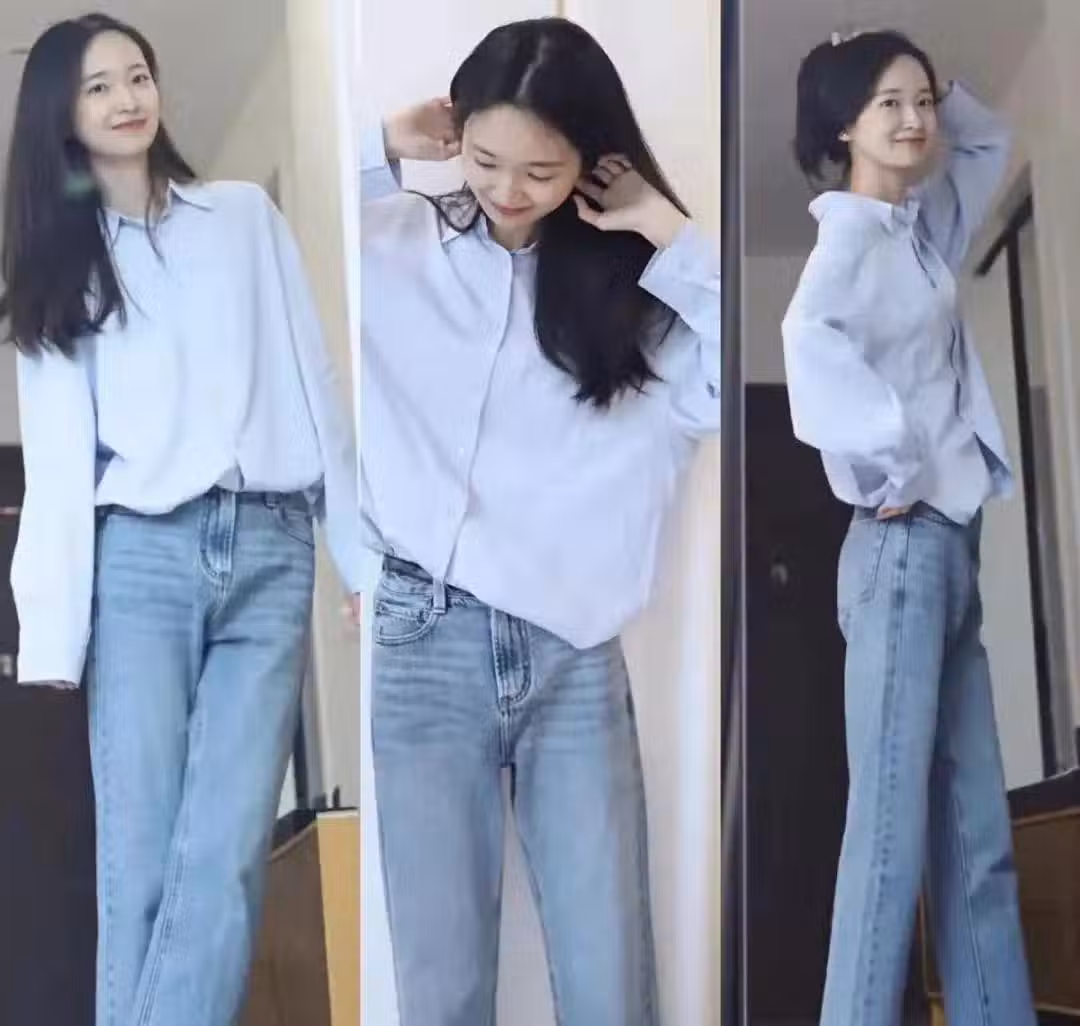 選擇高級顯質感的同色系穿搭方式,穿一件基礎款的淺藍色襯衫搭配一條淺色的牛仔褲,一身藍色系穿搭簡單舒適又清爽乾淨,十分減齡。