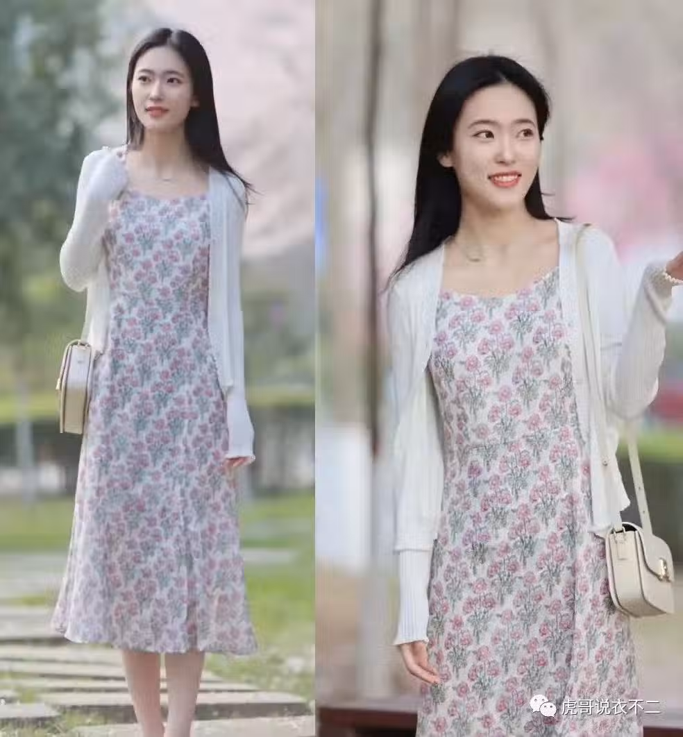 圖中這位博主就選擇了這樣的搭配方式,其中碎花裙洋溢出的小清新氣息,特別適合夏季的氣氛,令人穿出了淡雅又甜美的感覺。