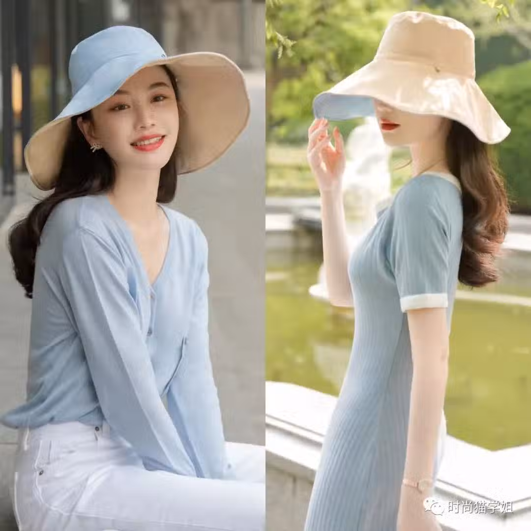 >>款式選擇 在漁夫帽的款式選擇上,建議大家根據自己的穿搭整體去搭配。例如下圖這種純色系的精簡穿搭容易顯得單調,就適合利用自帶設計感的漁夫帽進行點綴,以求增強整體搭配的層次感。例如這種帶有撞色設計的漁夫帽,自帶吸睛感的同時不會顯得太花哨。