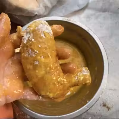 4、最後裹上一層麵包糠,盡量讓每一寸雞肉都有裹上