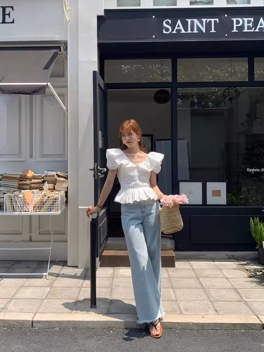夏天穿的小衫也可以利用起來,尤其是臉型比較柔和的姐妹,很適合這種溫柔十足的小衫,搭配一條牛仔褲,很輕鬆就拿捏住了。