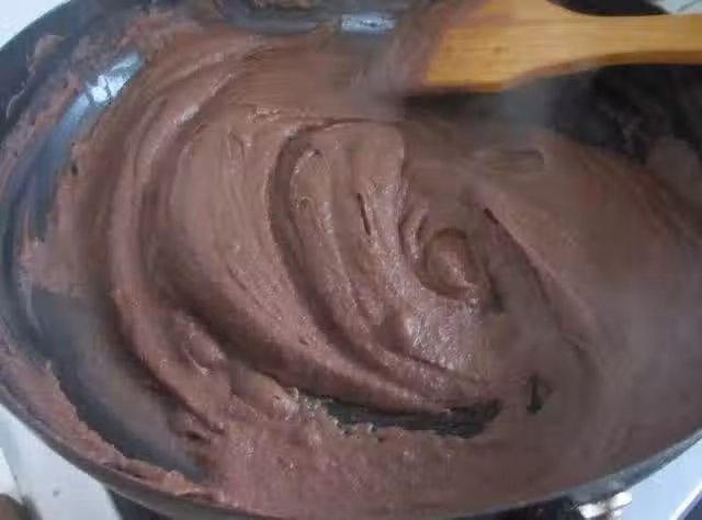 找一個乾淨的不粘鍋,一定要用不粘鍋,放入少量黃油,開小火融化後,將紅豆泥倒進去。