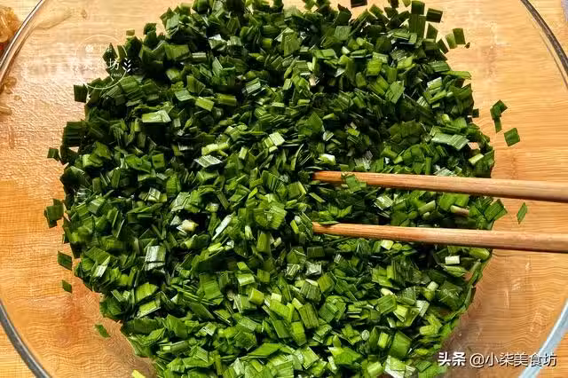第九步:把所有的準備好的食材都倒入裝韭菜的大盆里,加入適量的鹽,半勺十三香,一勺蚝油,最後再淋上一些香油,用筷子把這些食材充分的攪拌均勻,香噴噴的餡料就準備好了。