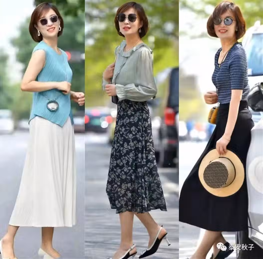 為了避免穿出「老氣感」?儘量避開棉質或亞麻等面料過於軟塌的半身裙款式,選緞面材質或是西裝材質、又或是質感性能極佳的絲質半身裙來搭配,更顯氣質和優雅。