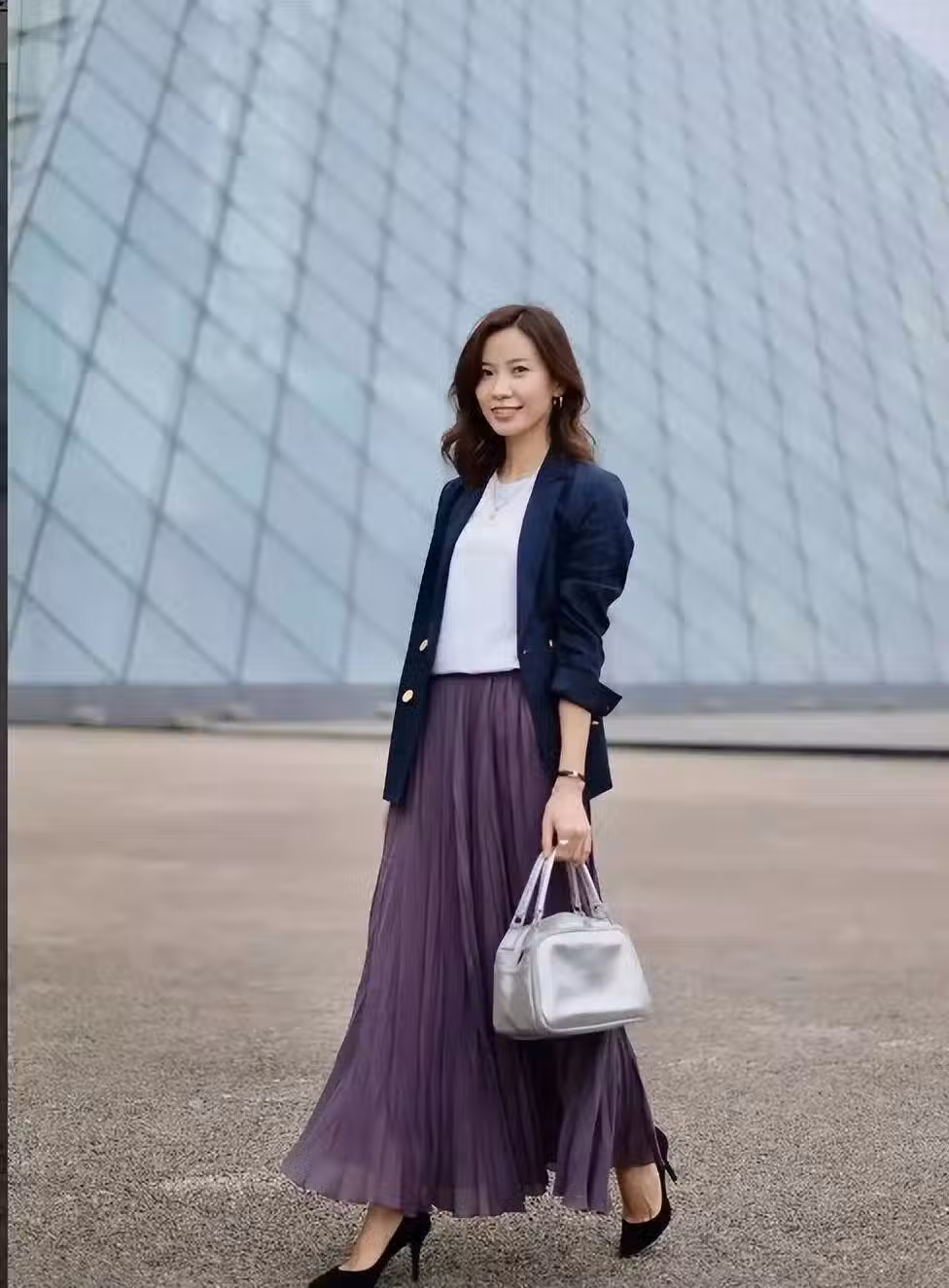 裙子雖然長但是顏色很鮮明,材質也比較輕薄,整體穿搭給人一種「氣勢磅礴」的活力感,所以重心要高一些,鞋子要小巧精緻此時。一個活躍的系統將有更多的減齡效果。