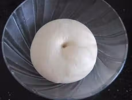第三步,蓋上一張保鮮膜開始發酵,待將其發酵至原來的2倍大,用手指戳一下不回縮的狀態句可以了,將其移至在案板上,排氣後,分成大小適中的小麵糰;