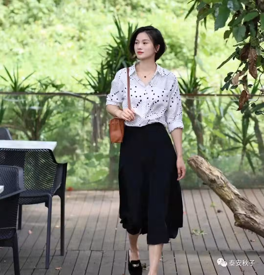 與知性氣質的襯衫足額會,呈現出優雅而又充滿少女的情懷。在純色襯衫上面,不規則地拓印波點元素,很有一股當代獨立女性的味道。