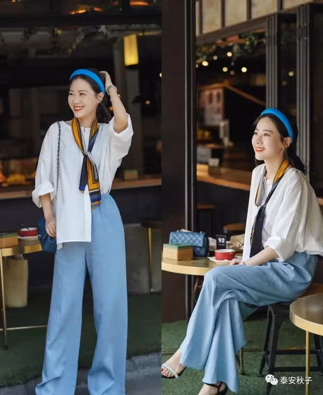 在脖頸間隨意掛條窄條絲巾,用與牛仔褲同色的發箍進行視覺層次感的營造,復古文藝慵懶的感覺就出來了