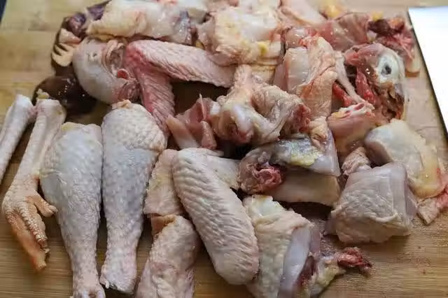 3、現在需要將家中的雞抓起來,將其毛給拔了,然後用刀子將土雞剁成一大塊一大塊就可,我們需要注意的是燉湯的雞不要切的太大也不需要切太小,大塊不容易煮熟,小塊容易煮爛,這裡需要十分注意的。