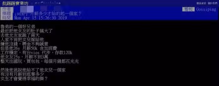 原PO還在下面留言補充說明:「買車要錢、房租要錢,平常所有開銷也都是我朋友在負責,對女友體貼,對她家人也大方,所以他老爸怪他沒存款,我們都傻眼」、「不可能剛當完兵就 50K ,後面肯定會越存越多吧,原來結婚條件這麼高,難怪大家不敢結婚」