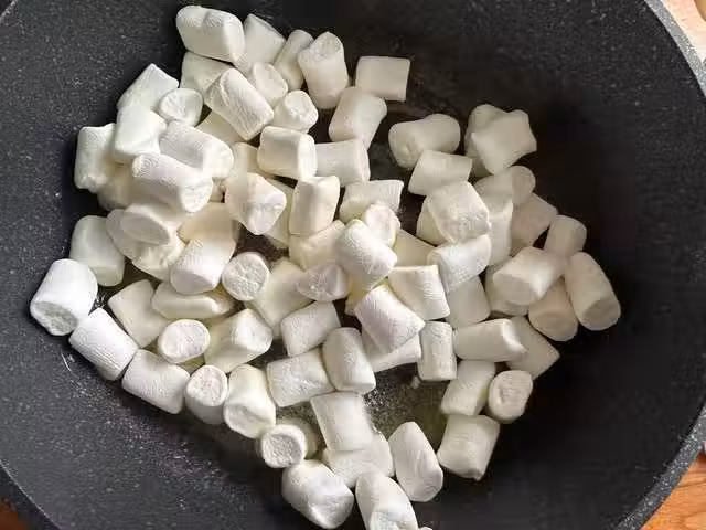 3、徹底融化之後加入奶粉和鹽,奶糕的奶粉用量比較多,把奶粉和棉花糖徹底攪拌均勻;
