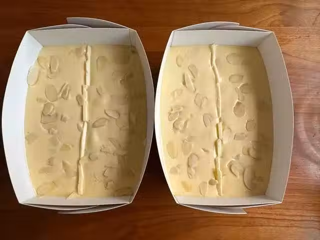 7、放進提前預熱好的烤箱,上下火150度烤大約60分鐘左右,出爐之後側著放涼,金枕蛋糕就做好了。