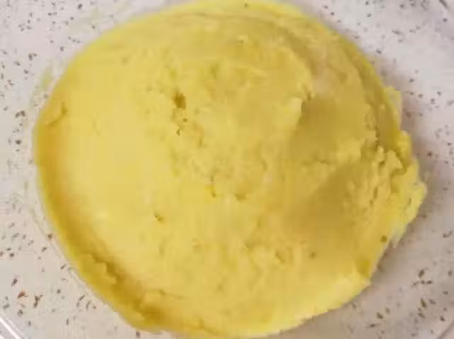 第三步:將打好的綠豆泥倒到不粘鍋里,加上70g的奶粉攪拌均勻,然後加入80g黃油,小火不停的攪拌至融化,大約炒10分鐘之後開始粘稠,繼續炒,最終炒至綠豆泥抱團,不粘鍋也不沾鏟子就可以了,出鍋。