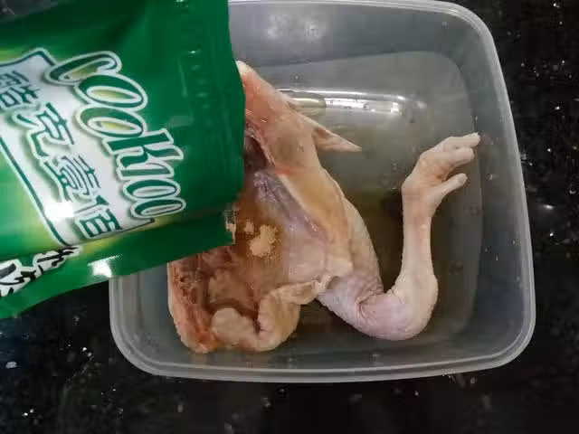 1.土雞半隻,洗凈,放在一個保鮮盒裡,用刀子扎幾個孔,加適量烤肉醬和黃酒,充分按摩。