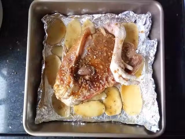 3.烤盤內鋪上馬鈴薯片,放上雞,先肚子朝上,用剩餘的腌制汁再刷一遍雞和馬鈴薯,